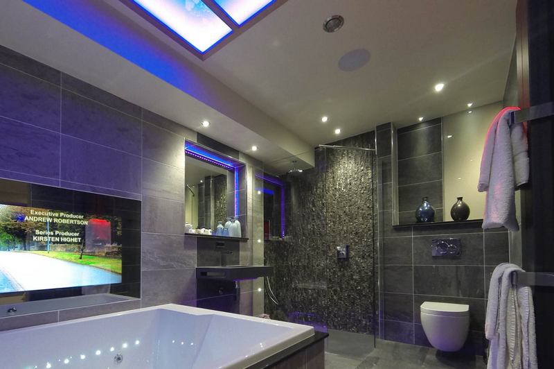 Подсветка из светодиодной ленты может располагаться в различных местах –на многоуровневом потолке, на полу или ступеньках, на зеркале, на мебели. LED лента выполняет функциональное или декоративное освещение. С ее помощью делают зонирование больших ванных комнат.
