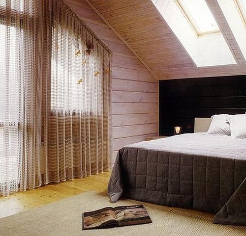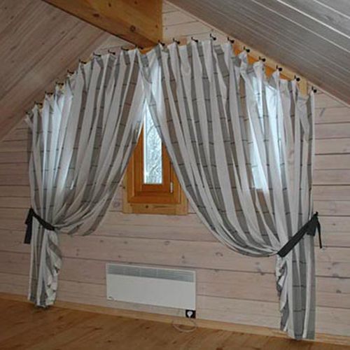 Если же окно размещено в самой кровле бревенчатой постройки, используют специальные римские шторы. Жесткая планка, расположенная внизу, помогает им удерживаться.