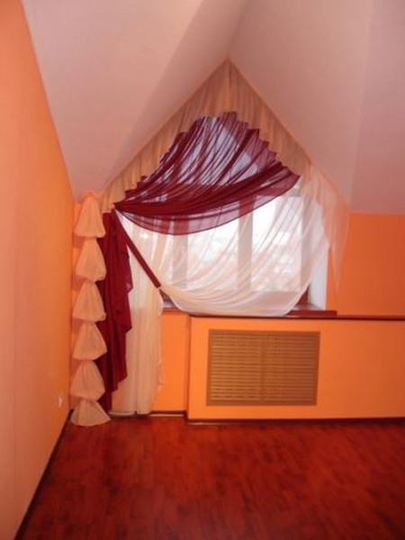 Перед тем как оформить окно, в ажно знать, что для треугольных скошенных окон штора будет подниматься только до начала скоса, то есть небольшая верхняя часть окна будет постоянно закрытой. Если окно очень узкое, то устанавливаются два карниза под углом. Подниматься в этом случае треугольная штора будет только до точки излома.
