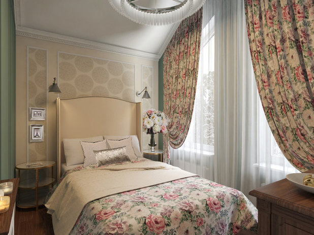 В спальне с большими окнами нет особого смысла экономить на материале. Более того, знатоки рекомендуют использовать свободно ниспадающие длинные занавеси. Очень хорошо, если они формируют плотные вертикальные складки.