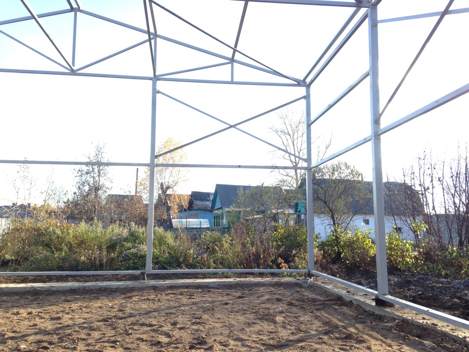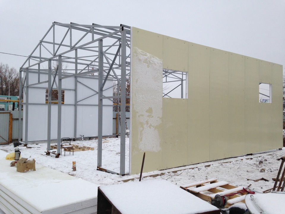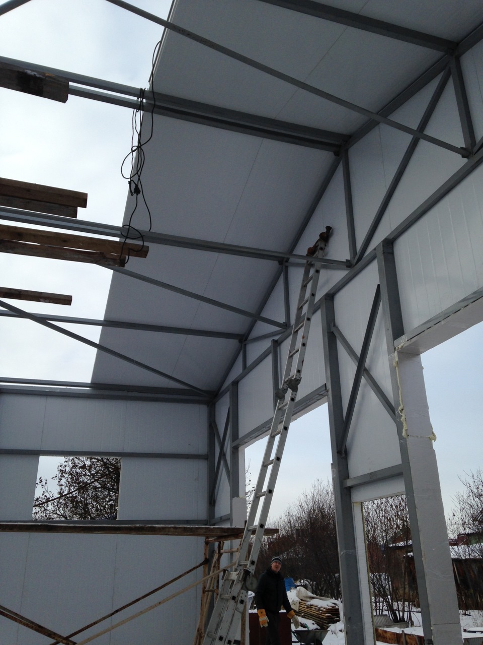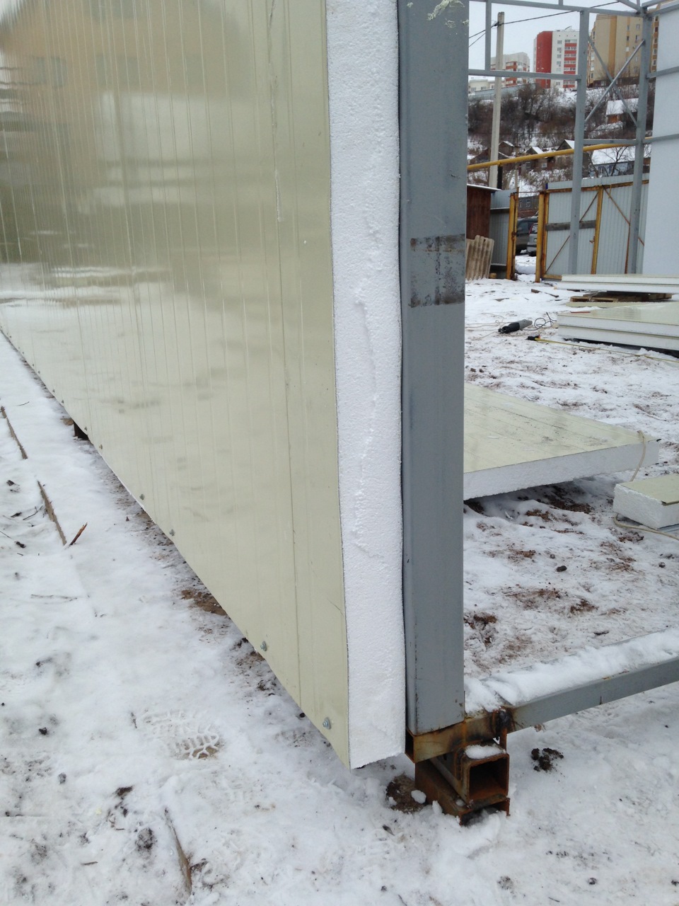 каркас из профильной трубы, обшит сэндвич-панелями — 10 см пенопласта.