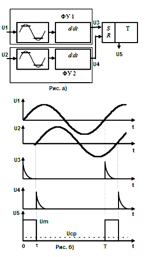Фазометры, работают по следующему принципу. В приборе контролируемый сдвиг фаз преобразуется в промежуток времени (рисунки «а» и «б»). Благодаря устройствам формирования ФУ из напряжений u1 и u2 образуются импульсы во время перехода напряжений через ноль в сторону повышения. Эти импульсы приходят на входы триггера Т, на выходе триггера образуются прямоугольные импульсы.