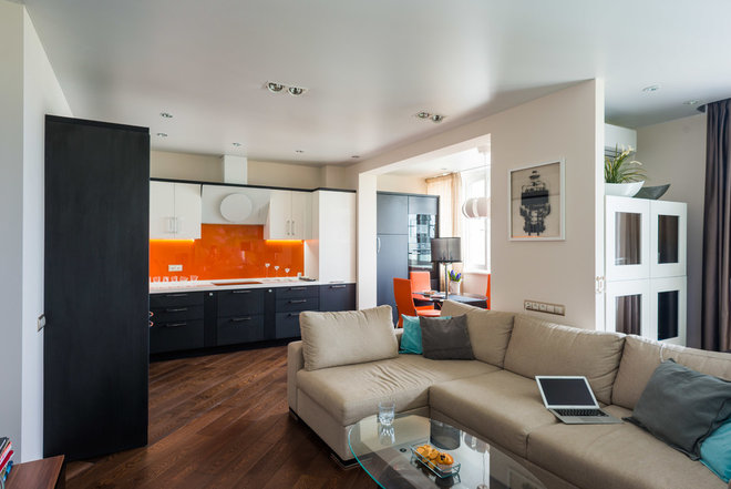 Оранжевый в таком осеннем интерьере преобладает, лидирует. Причем, в условиях нехватки тепла и света он ничуть не давит, а наоборот, радует и согревает.