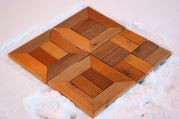Это декинг в форме красивых квадратных плиток со стороной 30 или 50 см. Каждая плитка состоит из пластиковой или деревянной каркасной подложки, поверх которой на саморезы или скобы крепится декоративная ламель из дерева или композита. По бокам подложки находятся удобные замки, благодаря которым модули легко сцепляются в монолитное покрытие любой площади. Широкий выбор оттенков, а также подбор узоров позволяет сформировать из паркета очень интересные напольные композиции.