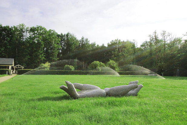 Для орошения газона используется дождевальная система полива. Благодаря распылителям почва увлажняется равномерно, корневая система получает необходимую влагу, а трава остается постоянно сочной и зеленой.