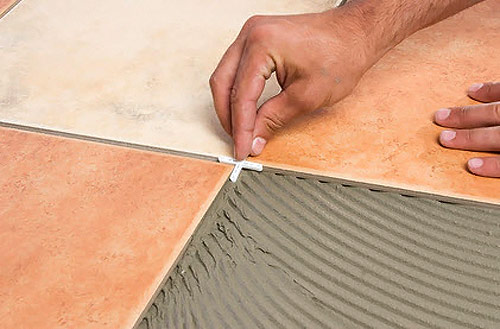 Чтобы укладка плитки из керамогранита получилась ровной и красивой, для создания постоянных зазоров между отдельными плитками используют при монтаже специальные крестики, которые удаляются после окончания монтажа.