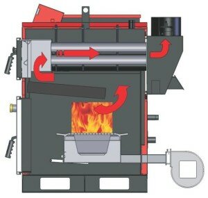 Первым каналом считается топка, а два других находятся выше один над другим. Вентилятор обеспечивает необходимую тягу, а также существует естественная тяга через колосники и вентиляционные отверстия.