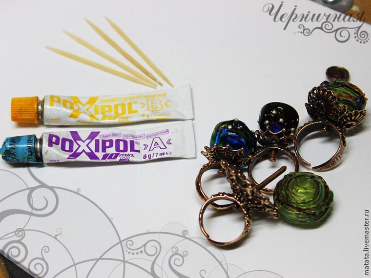 Попробуем сделать кольцо, используя наши основы. В качестве центрального элемента использована бусина лэмпворк, похожим образом можно использовать бусины из пластика, камня, дерева и других материалов. Обратите внимание, в мастер-классе используется двухкомпонентный клей “Poxipol”. Если ваша бусина из пластика или какого-то другого материала, проверьте, как этот клей будет с ним реагировать, или воспользуйтесь другим подходящим клеем.