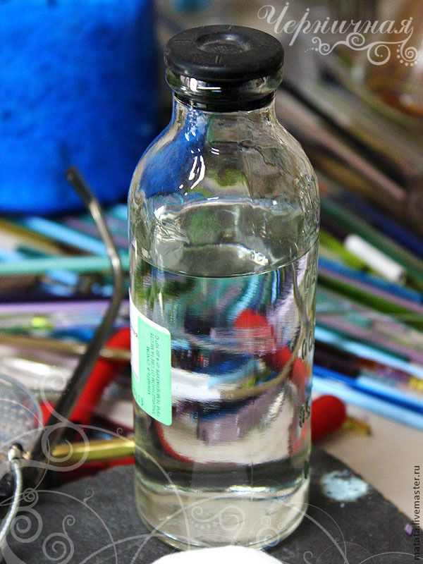 Работу начинаем с обезжиривания всех склеиваемых поверхностей. Тщательно протираем спиртом основу, штырь, шапочку и бусину.