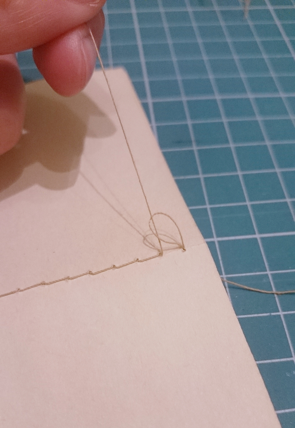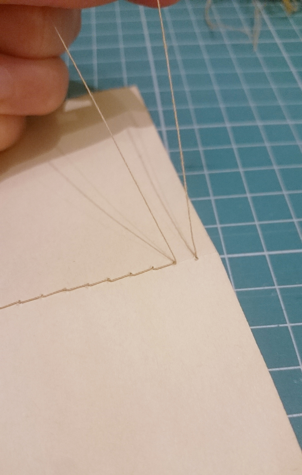И вот оно, последнее отверстие в верхней тетрадки. Выводим нить наружу.
