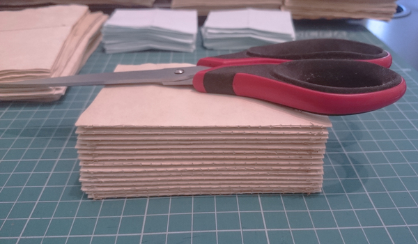 1. Нарезаем листы таким образом, чтобы при сложении получился нужный размер блока. Я делаю сразу много блоков (до 20 штук). Складываем их пополам по 3 листочка.