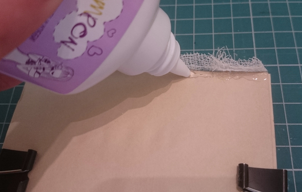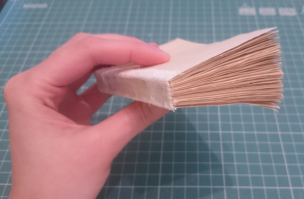 Потом берем кусочек картона и разравниваем наш клей/герметик по всей длине и ширине корешка, стараемся клей как бы втереть между тетрадками, чтобы он пропитал весь наш корешок!