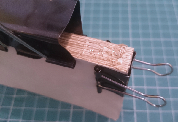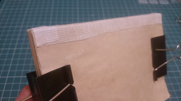 Ну и заключительный шаг. Берем наш прошитый блок, выравниваем и снова скрепляем по бокам при помощи картона и канцелярских зажимов. Берем клей или герметик и выдавливаем на корешок блока. Не жалеем, но и не горячимся)))
