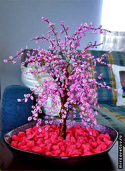 Очень нежно и романтично выглядит сакура бонсай. Делать веточки очень быстро, зная более простой вариант схемы плетения.