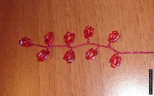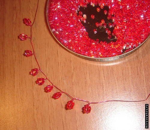 - Набрать на цельной проволоке 0,3 мм 8 петель, на каждой по 8 штучек бисера;