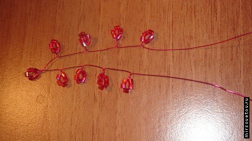 Потом берём проволоку длинной 45 см, набираем на неё 6 бисерин, располагаем бисеринки на 8-10 см от края.