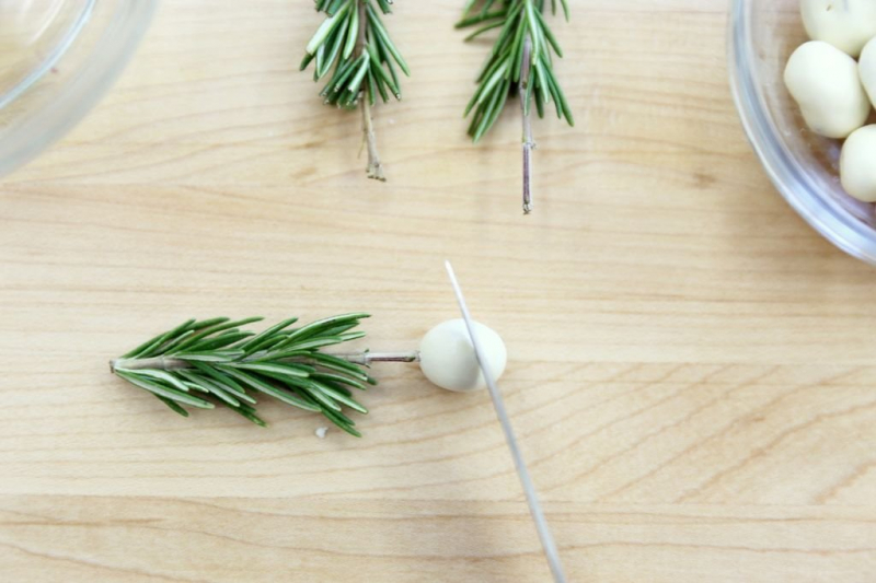 Понадобятся: елочные украшения (мелкие круглые бусины на леске), термопистолет.