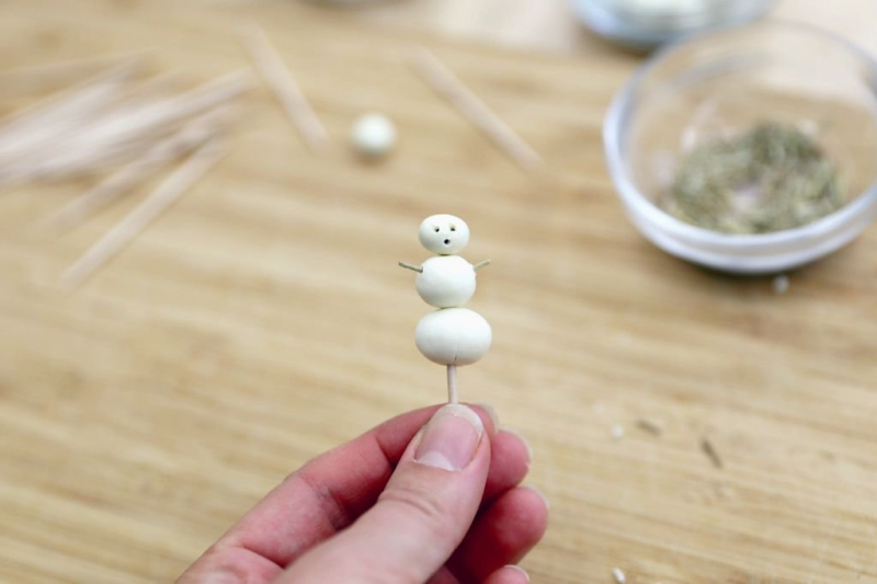 Не ждите пока искусственный снег засохнет – присыпьте смесь блестками белого снега. Стряхните излишек, а после того как снег окончательно высохнет, смахните остатки блесток кистью и начинайте лепить из полимерной глины морковку, глаза и угольки для лучезарной улыбки.