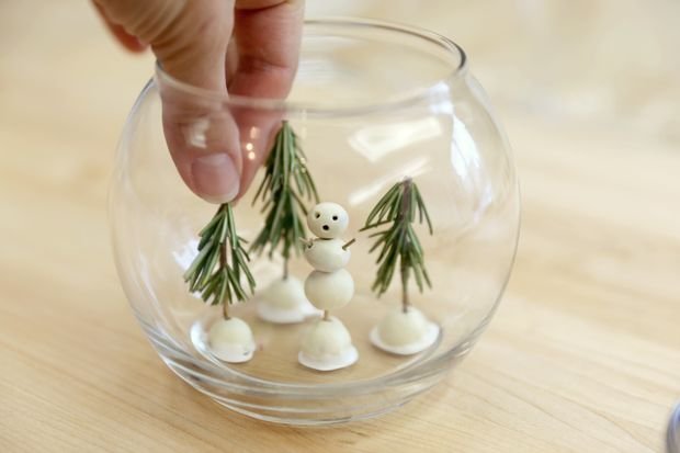 При отсутствии фантазии и креативности в целом идеи праздничного декорирования внутреннего наполнения сосудов можно подсмотреть в интернете. Как видно из примеров, для украшения подойдут любые подручные материалы, но особенно приветствуется тематический декор. Это могут быть, например, старые елочные игрушки в виде снеговиков.