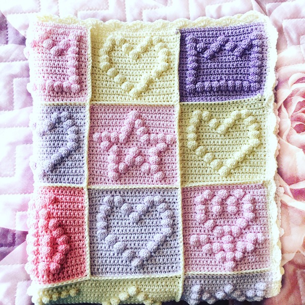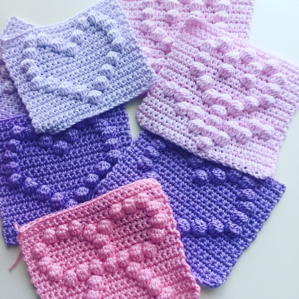 Наберите в Гугл bobbles crochet pattern – покажется много всяких схем, на любой вкус) а дальше надо под свой размер подогнать. У меня квадратик был 23 петли на 23 ряда.