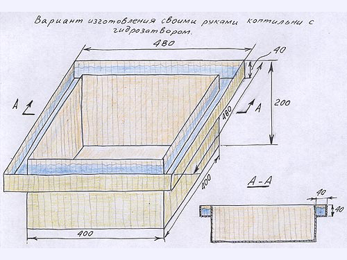 Приведенные выше конструкции коптилок отлично подходят для дачи или деревенского дома, но взять их с собой на пикник или рыбалку не получится — они слишком громоздки. В походных условиях их с успехом заменит мини-коптилка в виде ящика с крышкой, как на чертеже. Ее можно сделать своими руками и использовать как на даче, так и перевозить в багажнике автомобиля на место отдыха.
