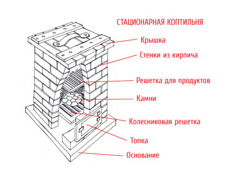 ● топка — она может быть сложена из кирпича или сделана из металлических пластин. Так как процесс обработки продуктов длится достаточно долго, топка должна быть оснащена удобным зольником, а также дверцей для дыма, которая регулирует основной поток;