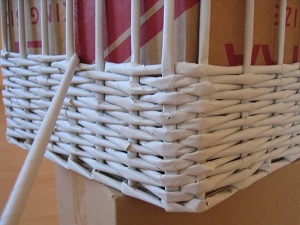 Основа оплетается доверху. Затем край декорируется: вертикальные трубочки загибаются внутрь и фиксируются клеем ПВА. Корзина покрывается лаком или морилкой на масляной основе.
