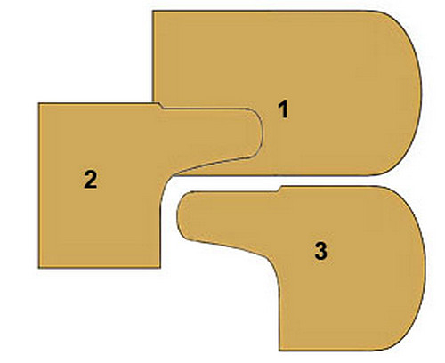 Детали с 1 по 4 обводим дважды в зеркальном отображении на выбранном нами материале. Деталь 5 рисуем четыре раза. Не забываем про две длинные полоски для увеличения объема.
