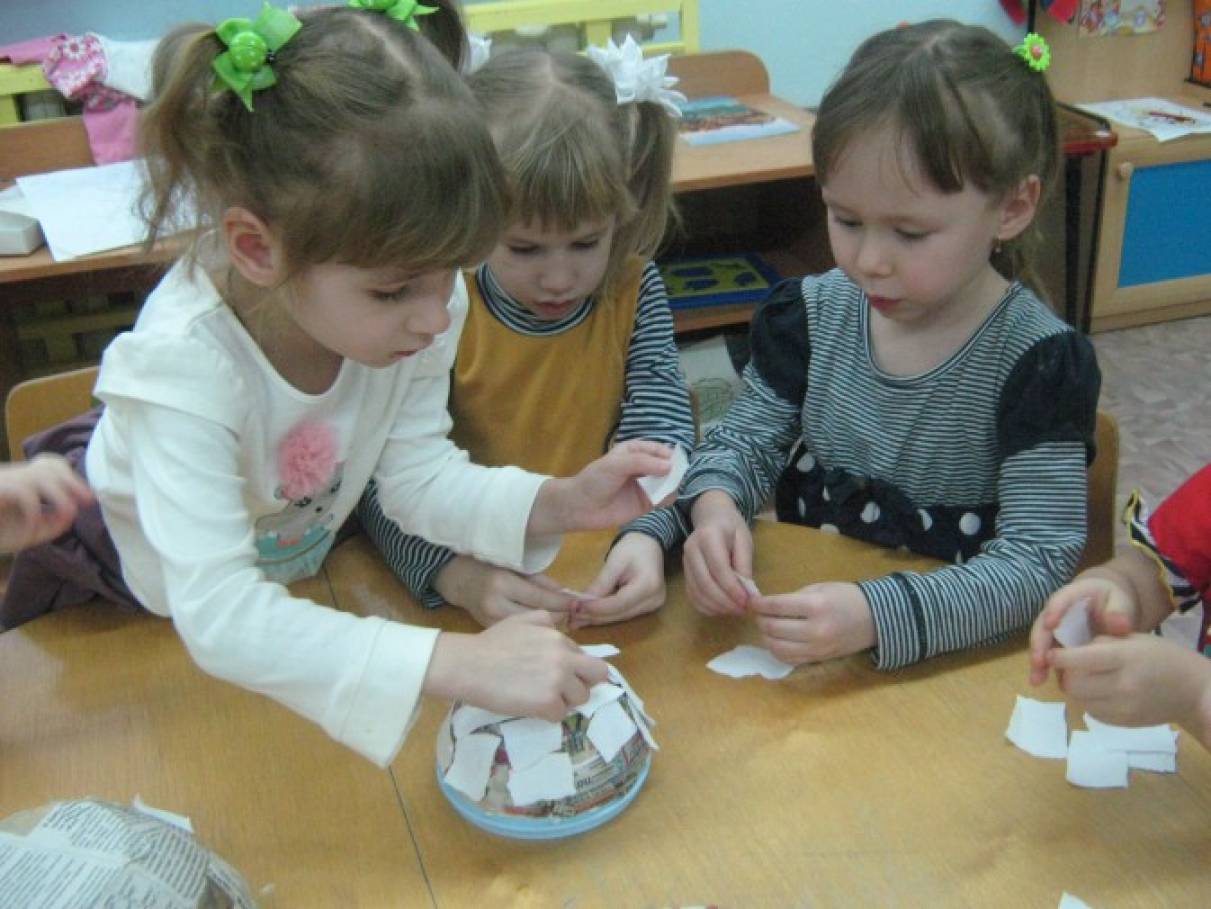 Вспомнить вместе с детьми, что делали на прошлом занятии, уточнить последовательность работы (рвали бумагу, выбирали форму, приклеивали бумагу к форме слоями, оставили сохнуть).
