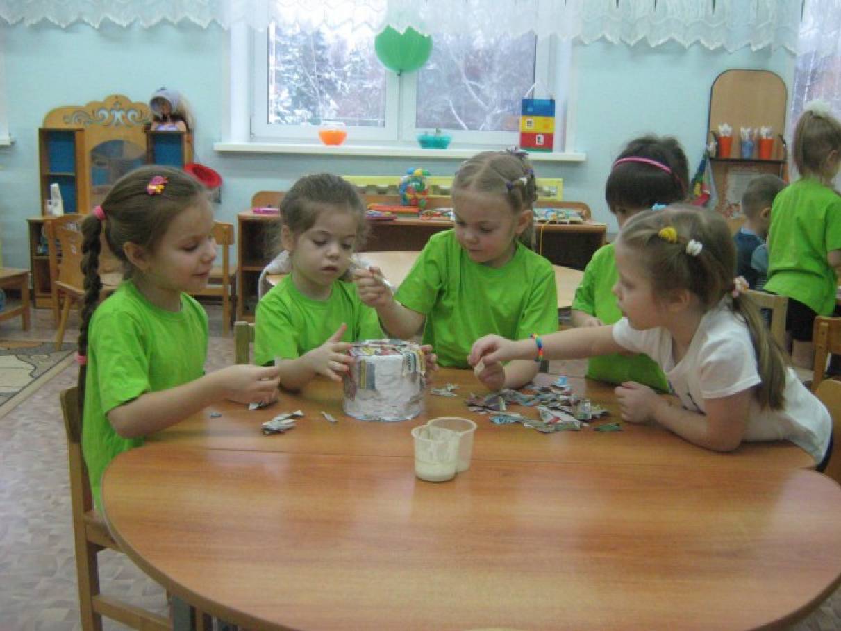 Пластиковые чашки двух видов, в качестве форм; газетная и тетрадная бумага (подготовленные детьми на прошлом занятии); емкости с водой для замачивания бумаги; клейстер; кисточки; сухая тряпочка для рук; вазелин; гуашь; вода в стаканчиках.