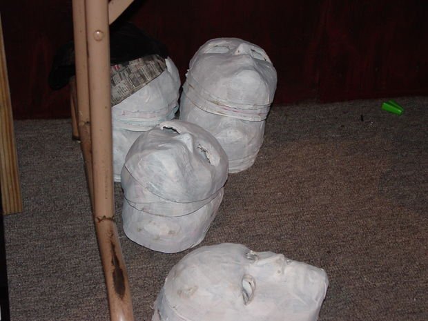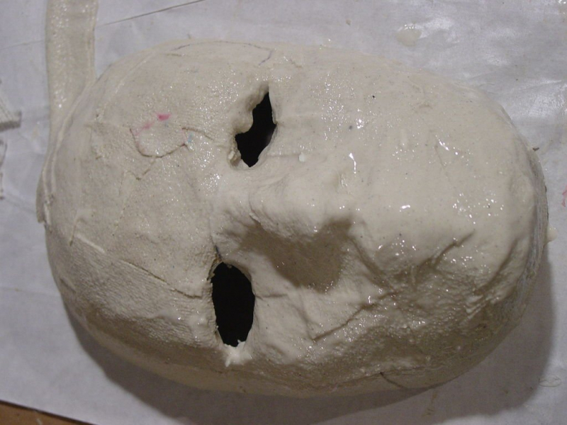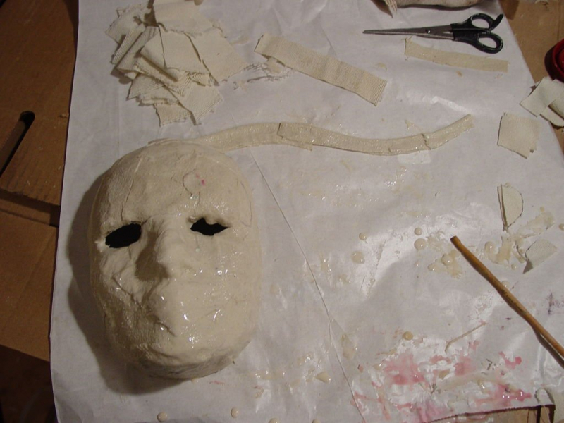 В остальных случаях лучше пойти самым простым путем и сделать основу для маски на голове манекена. Подобные части манекенов продаются для демонстрации головных уборов. Вам нужно уложить голову горизонтально, закрепить ее на рабочей поверхности, чтобы во время работы она не падала. Далее на голову накладывается и фиксируется пищевая пленка, и уже после, в технике папье-маше, приклеиваются кусочки бумаги. Запомните, наклеив несколько слоев бумаги, дайте им полностью просохнуть и уже после приступайте к приклеиванию следующих. Основа для маски будет готова к дальнейшей работе, после полного высыхания бумаги.