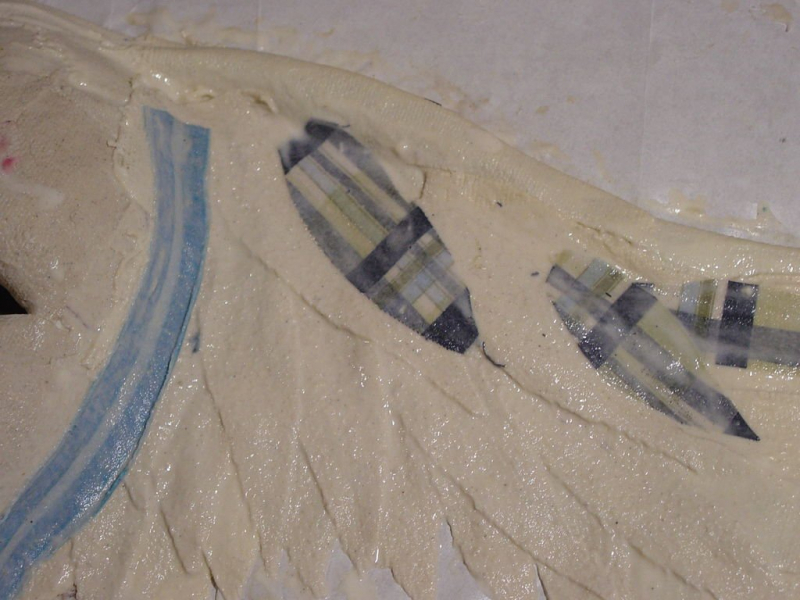 Шаг 6. Вырежьте перья для крыльев из ткани, смачивайте их в растворе клея и выкладывайте в виде крыла.