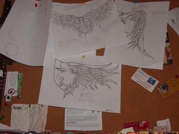 Шаг 2. Пока основа для маски высыхает, на бумаге нарисуйте эскиз вашей маски. Добавьте декоративные элементы, исходя из задуманного вами образа. В данном случае к основе из маски будут приделаны крылья, но только с одной стороны.