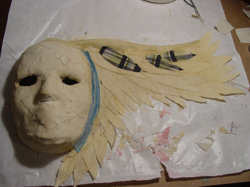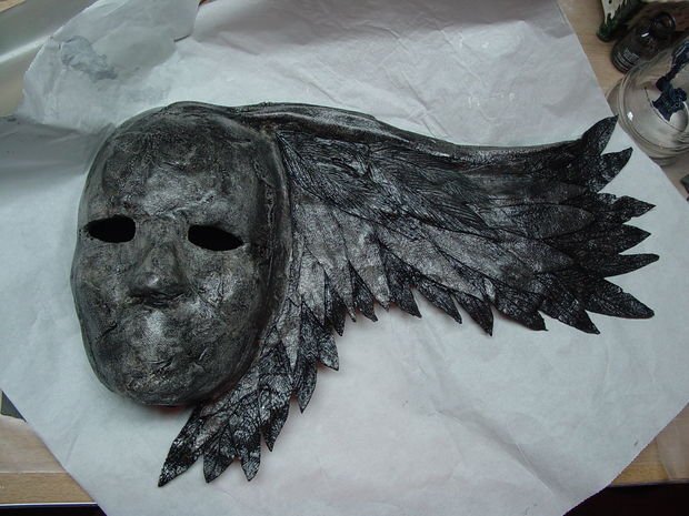 Шаг 7. Выкладывайте крыло несколькими слоями перьев, но обязательно дайте просохнуть каждому слою. Так как для изготовления данной части маски используется ткань, времени на высыхание понадобится больше.