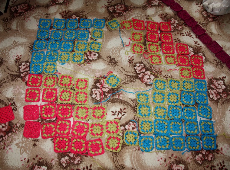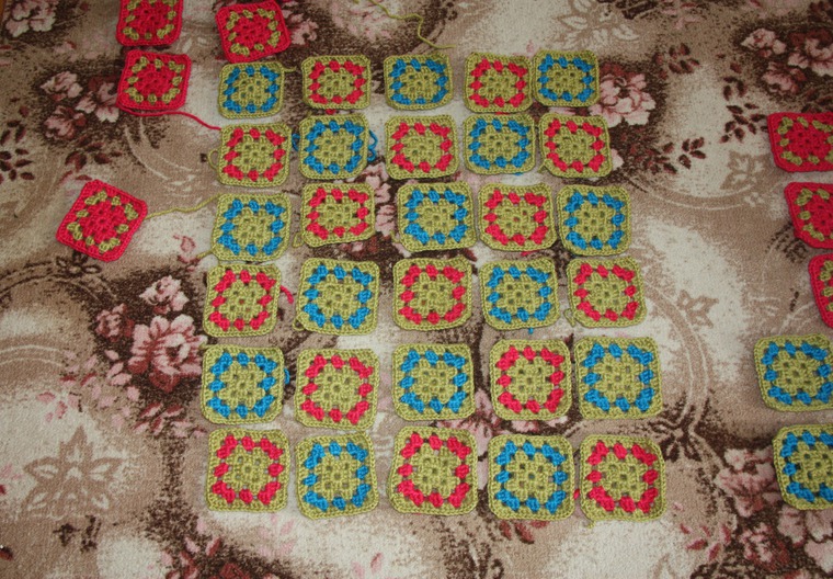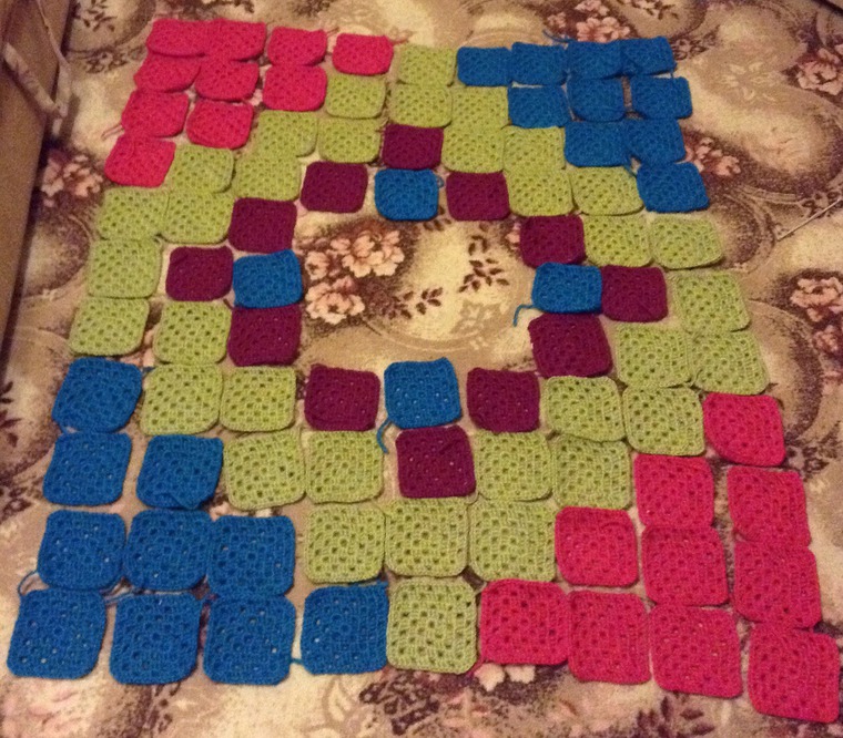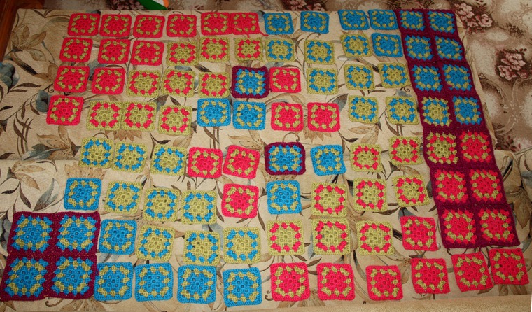 Когда купленная пряжа разошлась, стало ясно, что я снова поеду на закупку. Но встал вопрос: какого цвета докупать и сколько? Начала раскладывать квадратики. Сначала вперемешку, один цвет за другим. Получалось, что цвета шли по диагонали.