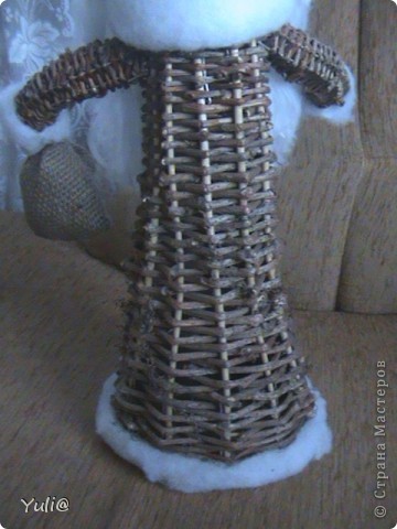 На праздничном столе оригинально смотрится напиток в сосуде, оплетённом ивовыми лентами. Ёмкость измеряют, делают крестовину из шести веток, плетут дно большего размера, чем на бутылке. Боковые стоячки добавляются как на корзинке, закрепляются вверху. Для нижней части используют двойное плетение, затем переходят на простой вариант. Начиная от середины, количество стоек уменьшают, чтобы сузить работу по горлышку. Верх заканчивают верёвочкой, лакируют.