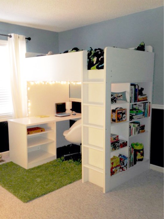 - Если ребёнку уже больше 6 лет, то интересным вариантом для него будет кровать на втором ярусе. Она экономист много места. К примеру, под кроватью можно поставить письменный детский стол икеа или мягкий диван, комод или игровую зону. Но смотрите, чтобы ваш ребёнок спал ночью спокойно, иначе есть риск упасть со второго яруса.