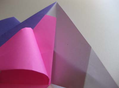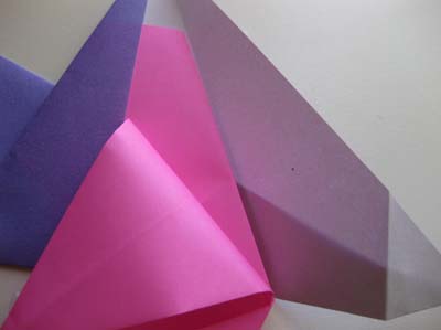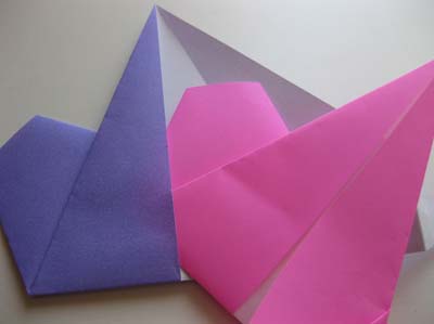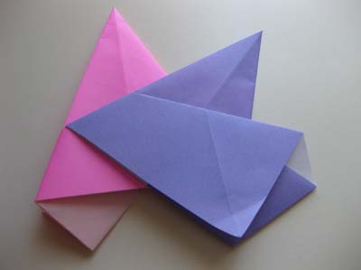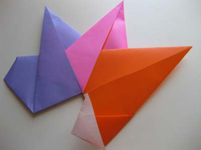 - По линии малого треугольника сделайте отгиб нижнего края к себе, прожмите место залома. Разверните нижнюю часть заготовки и вверните выпуклый треугольник внутрь (см. рис. 1). Сделайте еще 3 такие поделки из бумаги (такого же размера, цвета произвольно);