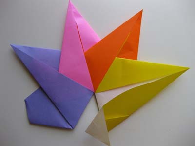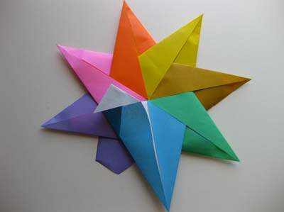 Теперь сложный момент: четыре луча вы согнете без труда, а вот чтобы согнуть пятый, придется аккуратно отогнуть первый луч, и заправить пятый внутрь. Если справились – красивая звездочка готова!