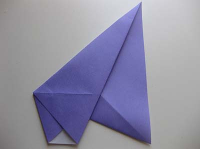 - Верхние углы заломите вперед, совмещая сам уголок с линией центрального прогиба. При этом нижние углы должны остаться ровными, существенно заостряясь. Повторите действие со вторым верхним углом;