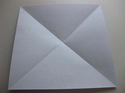 - Квадратный лист (можно сделать из стандартной офисной бумаги А4) сложите по обеим диагоналям, потом пополам и вновь пополам до маленького квадрата — разметка готова, разверните заготовку в начальное положение;