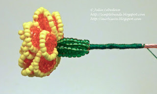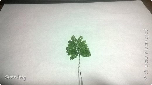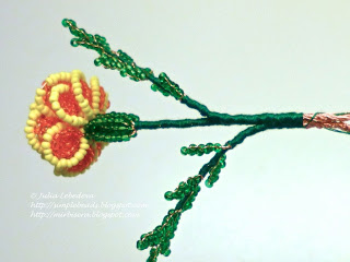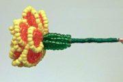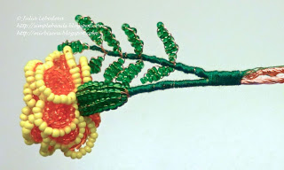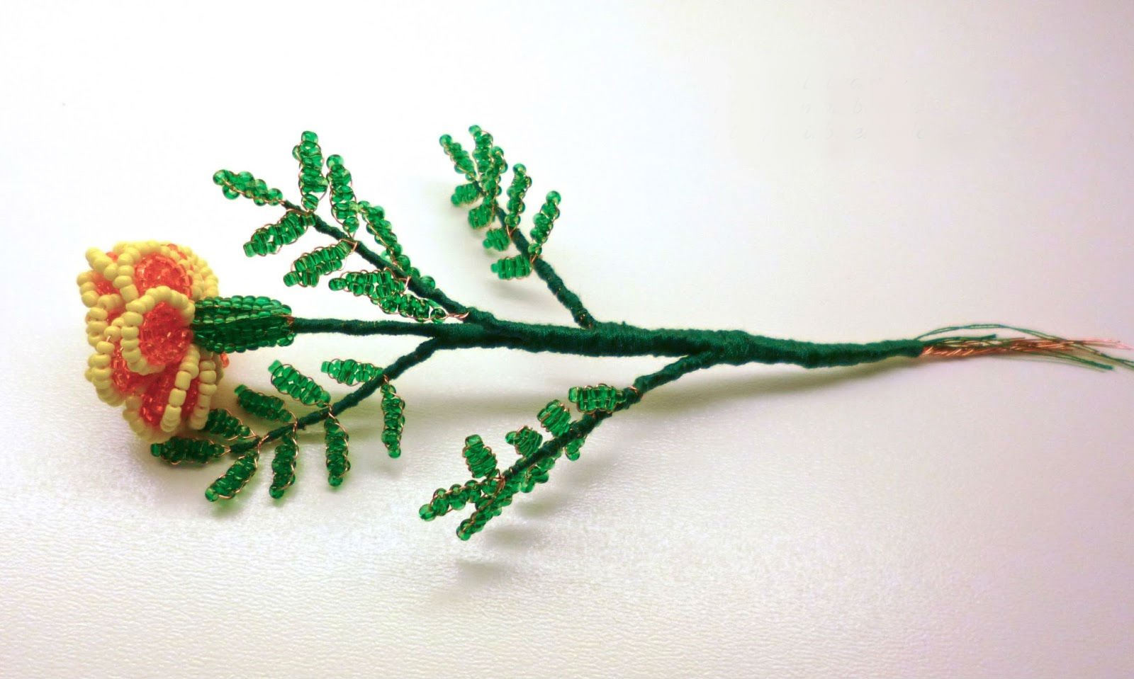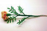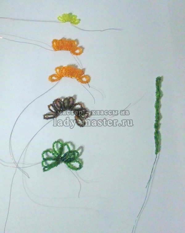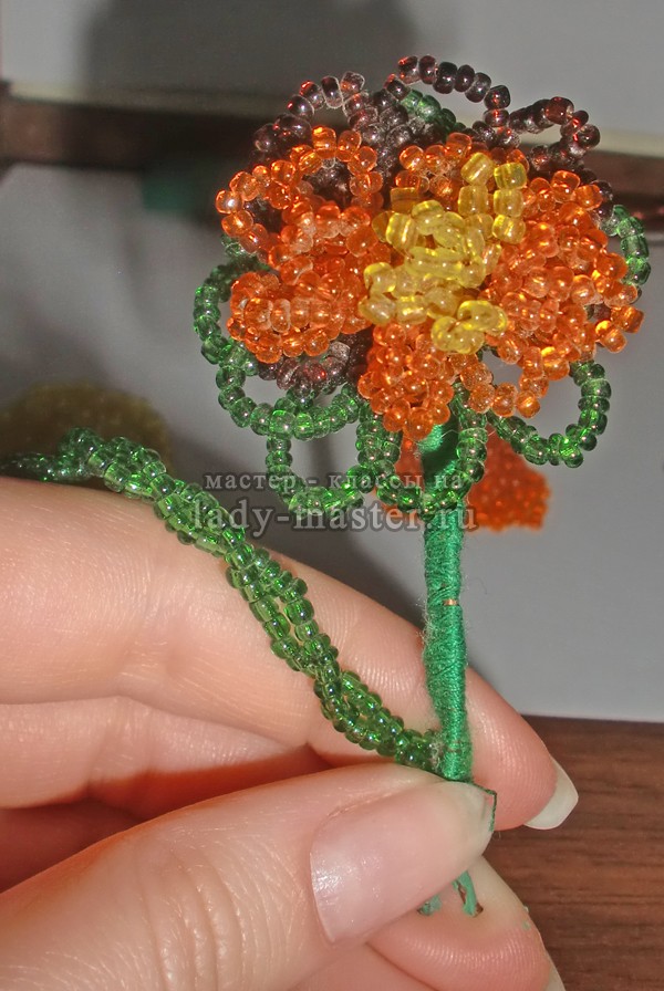 Последний элемент – листочек. На некоторых бархатцах листочка может быть 2 или 3, но все они изготавливаются из 1 петли, на которую нанизаны 100-120 бисеринок в зависимости от предполагаемой высоты ножки цветка.