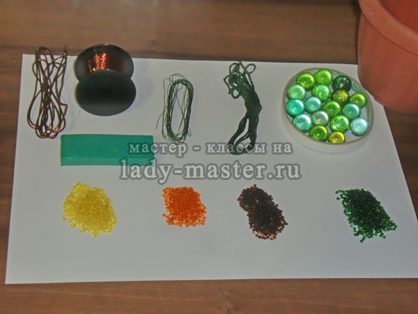 Бисер желтый, оранжевый, темно-коричневый, зеленый.