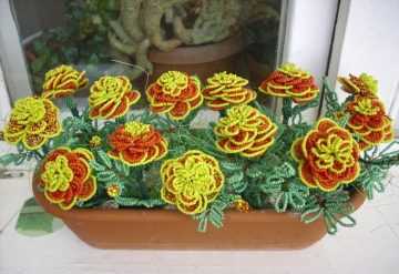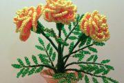 Бархатцы – небольшие садовые цветы, которые отличается ярким окрасом оранжевого цвета. Сделать из бисера это растение смогут даже начинающие мастера. Чтобы цветочная композиция смотрелась привлекательно, необходимо сплести побольше цветов, ведь обычно бархатцы славятся пышным цветением.