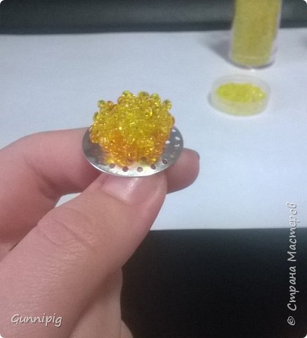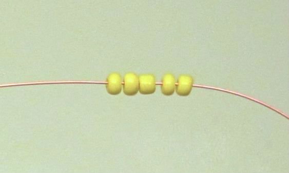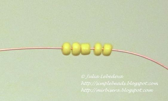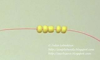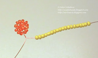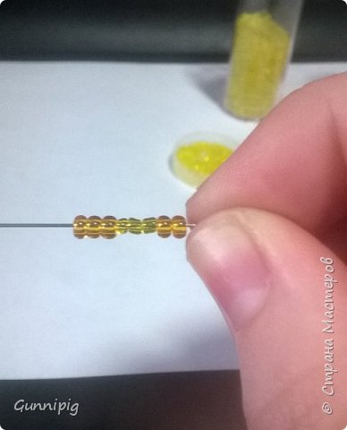 Оплетаем первый ряд желтым бисером. Набираем 9-11 бисеринок на леску.