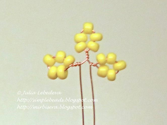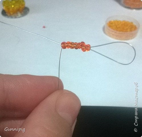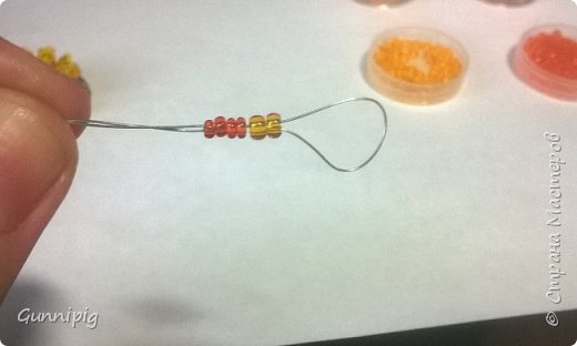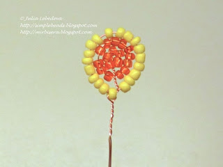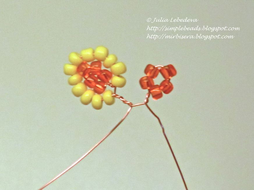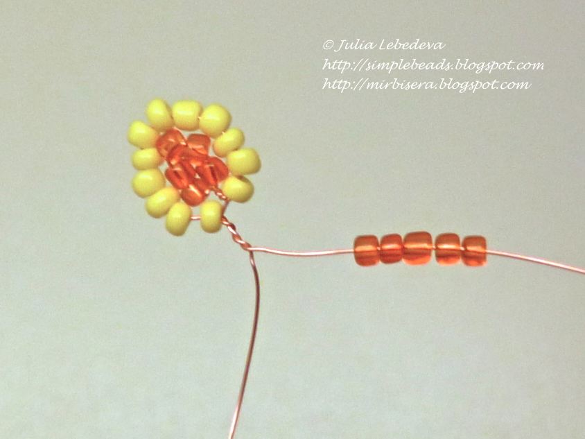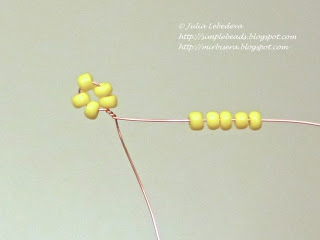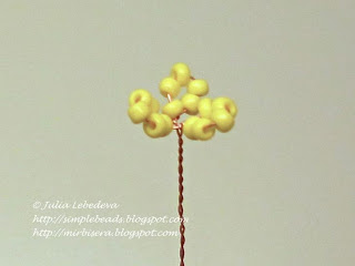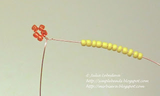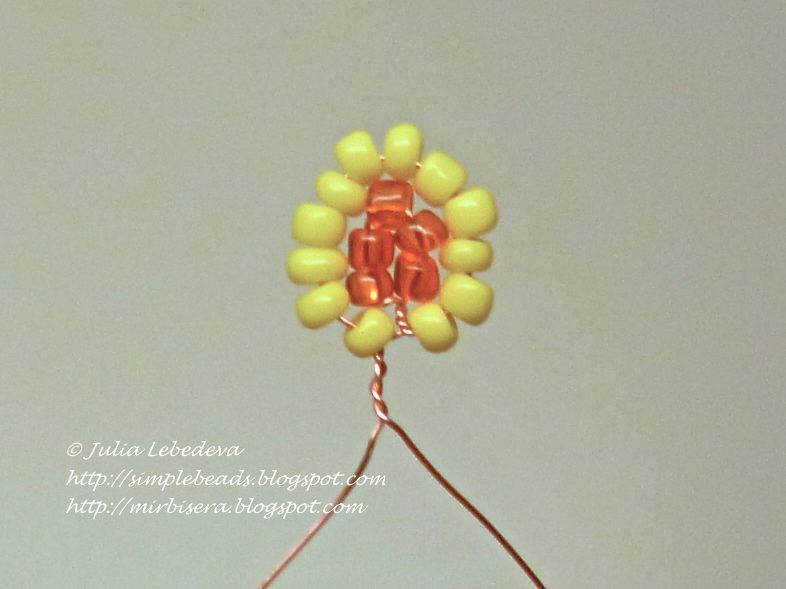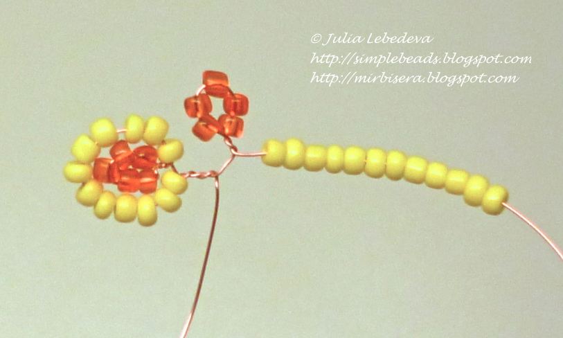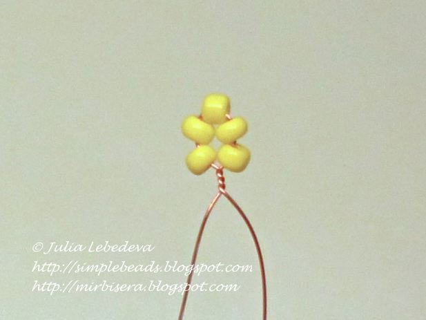 Затем сплетите петлю на заканчивающемся кусочке проволоки. Наберите 12 бисеринок желтого цвета.