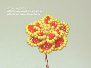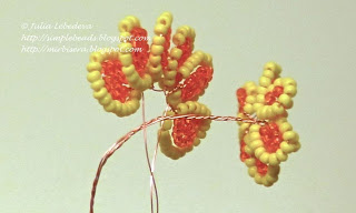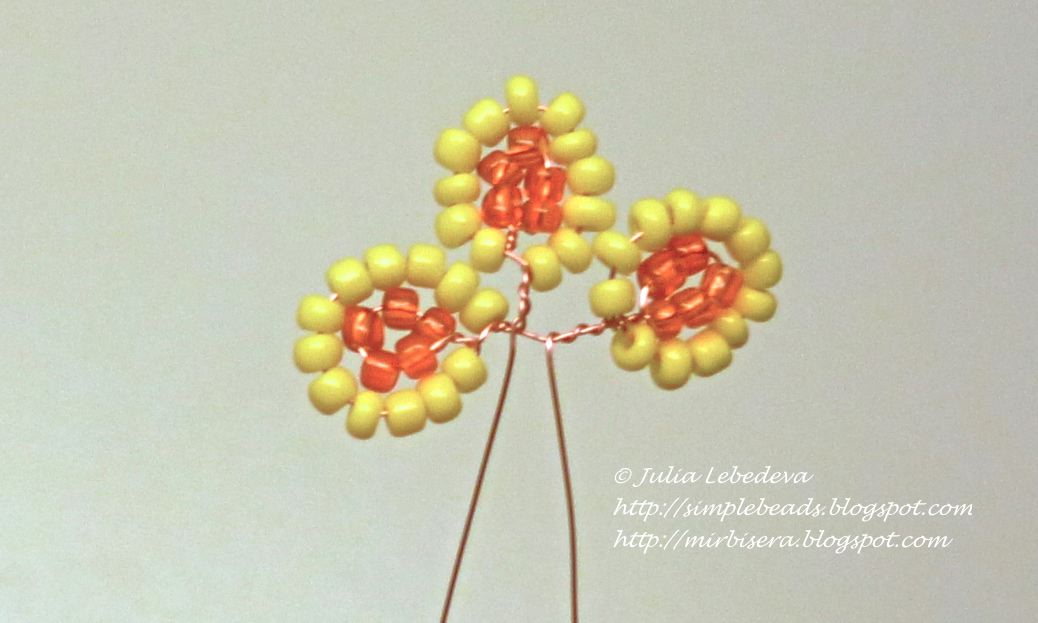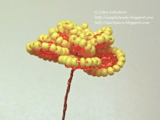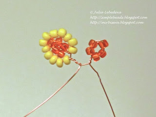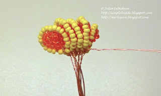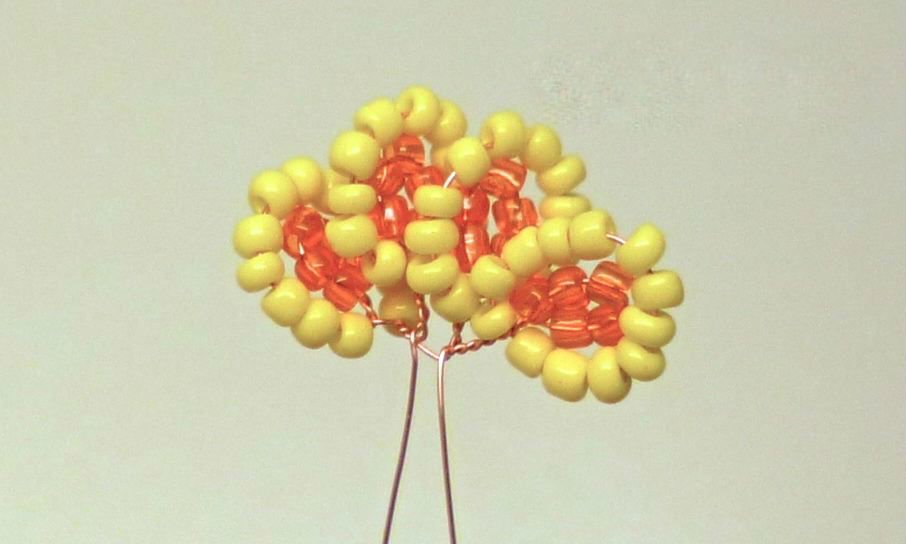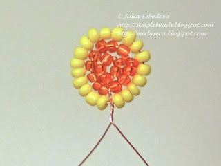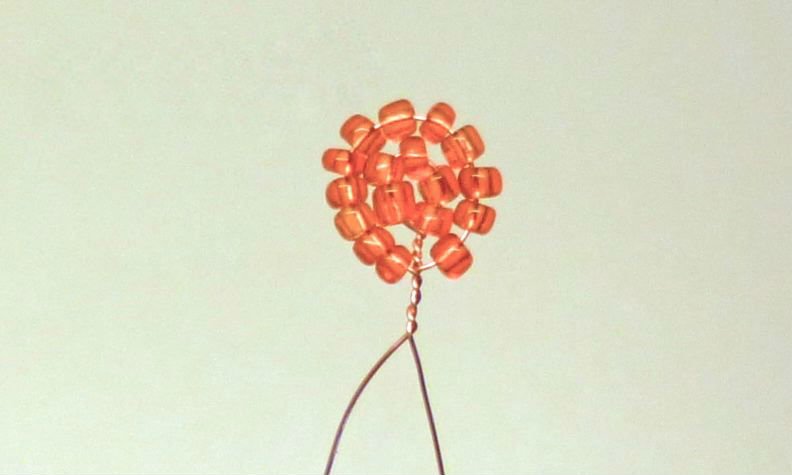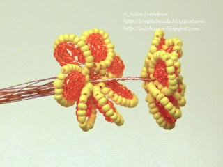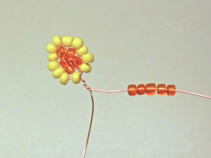 Далее последует ряд№3. Сплетите 6 лепестков на проволоку, длинна которой составляет 80 см. Технология плетения аналогична предыдущей, но лепесток ряда №3 будет состоять не из двух, а из трех петель. Петлю, состоящую из 5 бисеринок оранжевого цвета, разместите в 15 см от кончика основы. Последующее плетение будет проходить на ее длинном конце.
