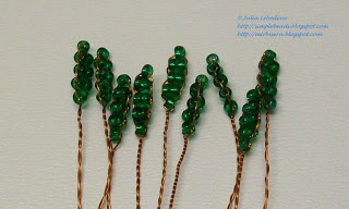 Положите готовый бутон на плоскость верхней частью вниз. Расправив все проволоки в стороны, на каждую скрученную пару и отдельно идущие концы наденьте по 8 зеленых бисеринок.
