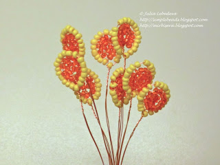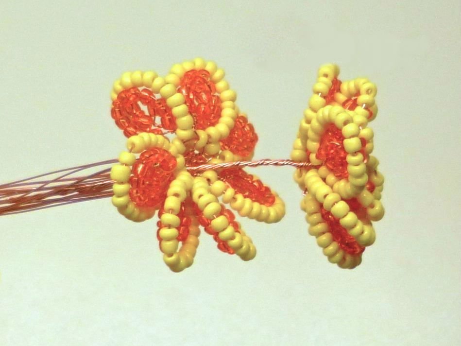 Части цветка в четвертом ряду тоже похожие, но плетутся отдельно друг от друга, исходя из этого каждому лепестку нужна индивидуальная проволока в 40 см. Первая петля составляет 5 оранжевых бусин, расположите ее посередине проволоки.