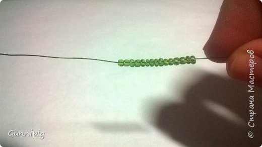 Теперь можно приступать к созданию листьев бархатцев. Для этого на проволоку в 20 см наденьте 9 зеленых бисерин, используя технику параллельного плетения.